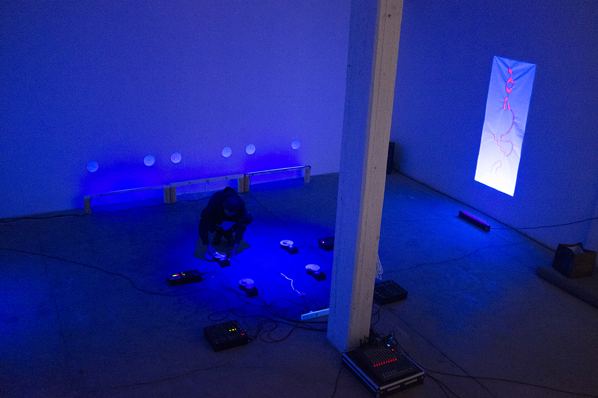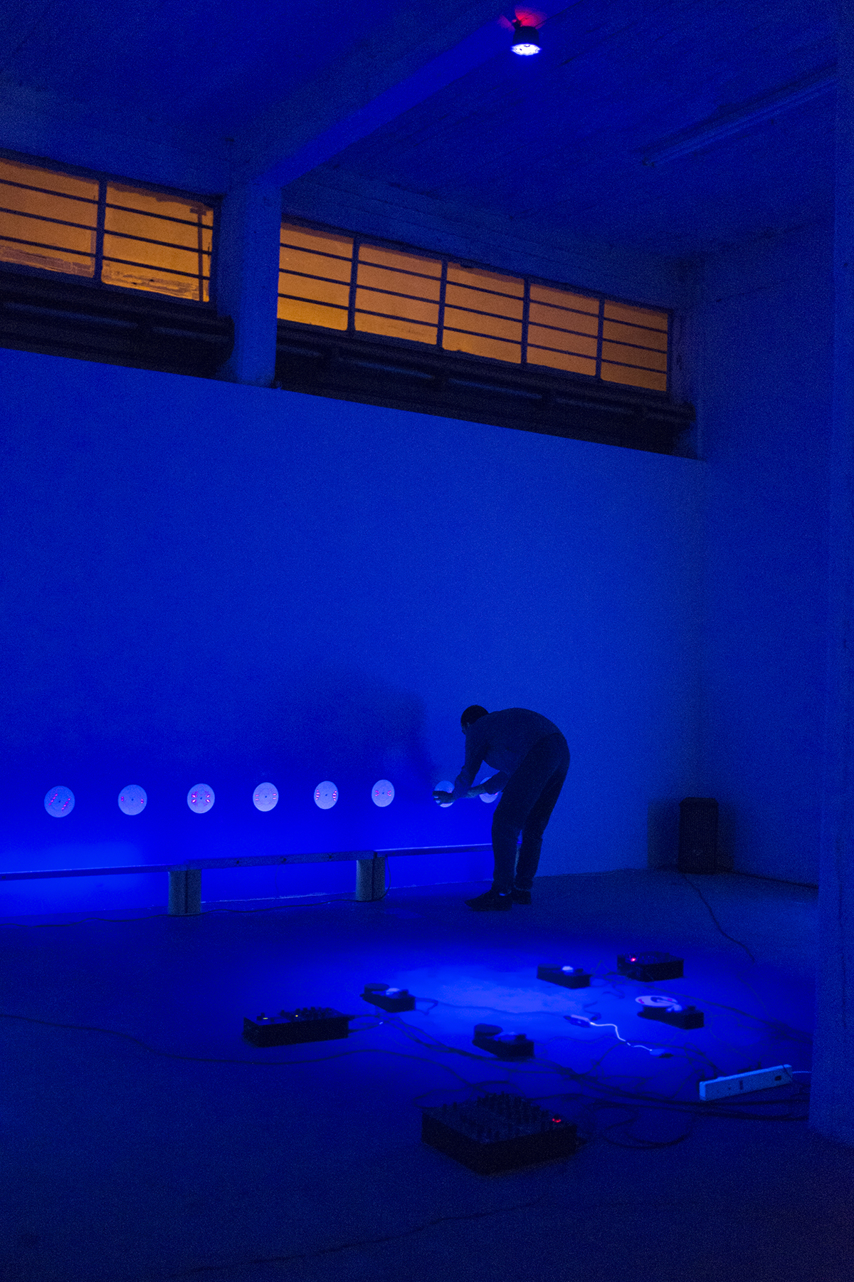 Orbital is Nico Stephou’s multidisciplinary project in which he creates sounds out of shapes. By creating a family of symbols, he proposes a language. These symbols are translated into records, one record for each. The combination of these symbols lead to sound-sentences. By playing four of them at the same time on a quadraphonic sound system, the artist creates a sonic image of this graphical conversation.