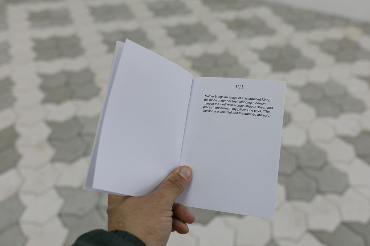 Passion Play is a meditation on what the sublime becomes when it is salvaged from the parallel dogmas of religion and rationalization. In discovering an individual perspicacity, a muted truth emerges: that the holiness that has been pristine is capable of withstanding mundanity; that mundanity is thereby elevated to the sacred. Blurring the lines between holy and profane, it liberates and democratizes the religious feeling. What was once untouchably sacred becomes touchingly vulnerable, and vice versa. The holy is witnessed in garden tiles crafted with a loved one; in vandalism; in the ritualistic washing of dishes; in poetry and play. Neither dogmatic nor secular, Passion Play inhabits the spaces of the everyday sublime.